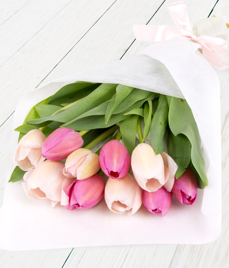 Floral Content: 5 stems white Tulips, 5 stems pink Tulips. Sundries: White Wrap and pink ribbon.