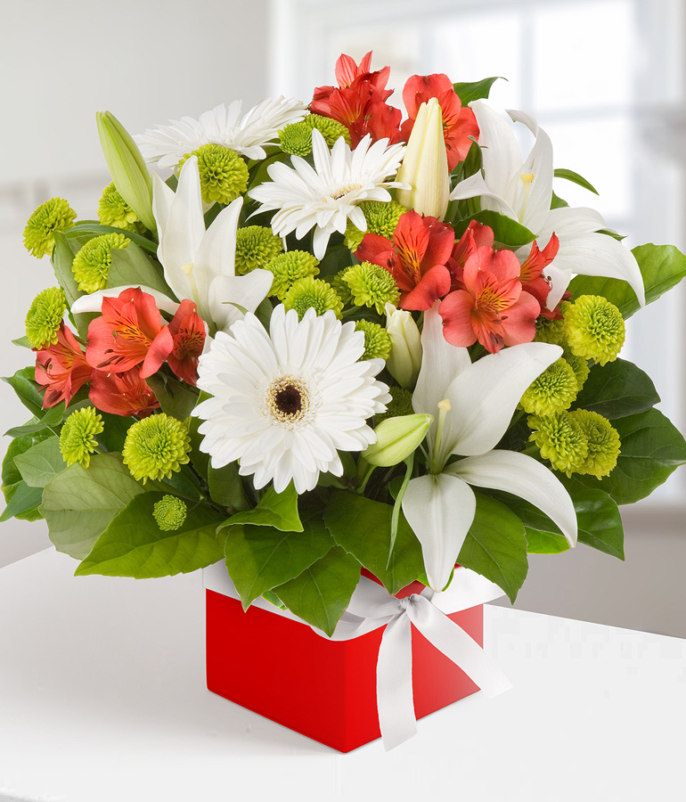 Floral Content: 3 stems white Asiatic Lily, 3 stems white Gerberas, 5 stems green button chrysanthemum, 3 stems red Alstroemeria and foliage. Sundries: Medium red box, cellophane, gerbera wire, floral foam and white ribbon.